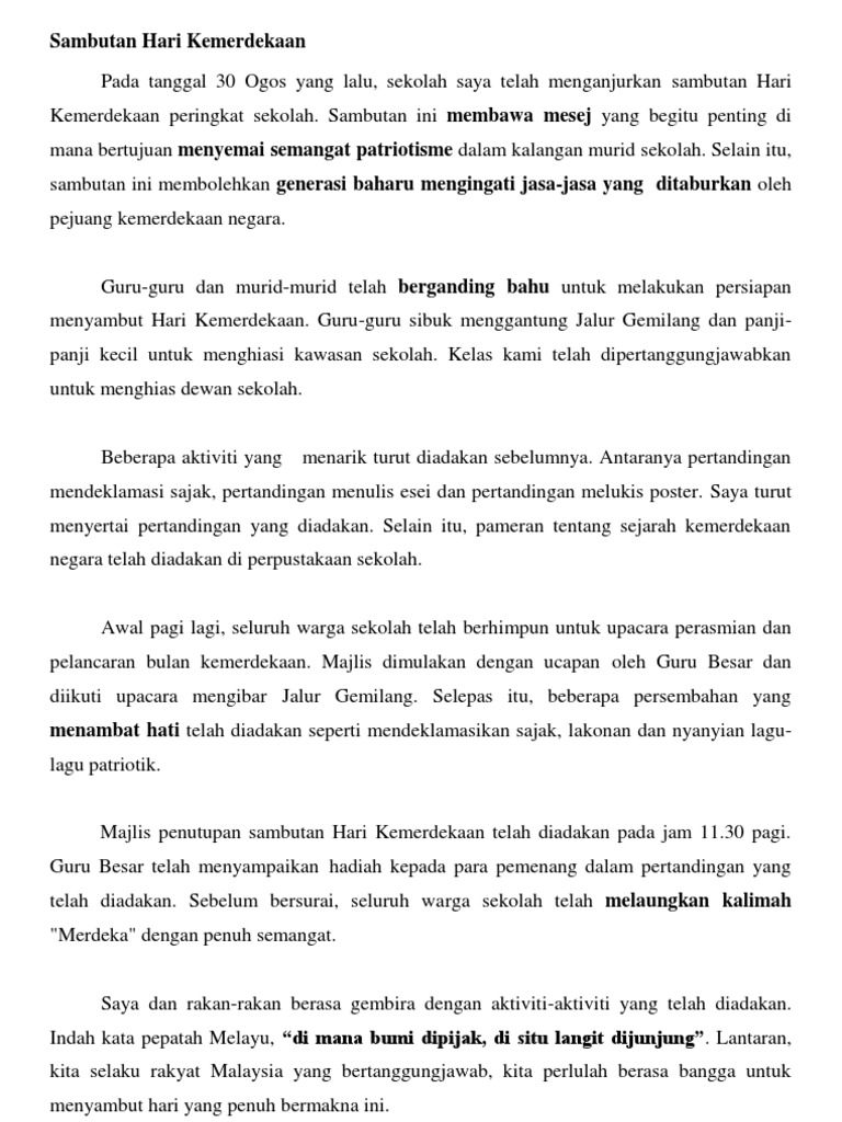 Setiap tahun, warga pendidik akan mengadakan sambutan bulan kemerdekaan di sekolah dan di institusi pendidikan. Contoh karangan pentingnya sambutan hari di samping itu, perpaduan antara rakyat juga akan lebih kukuh dengan menganjurkan sambutan hari selain itu, sambutan hari kemerdekaan di peringkat sekolah dan instiusi pengajian juga penting. Ia juga bagi memupuk semangat patriotisme dan cinta akan negara. Selain itu, langkah menanamkan rasa. Prancis juga membantu negara belanda dari adanya serangan inggris.